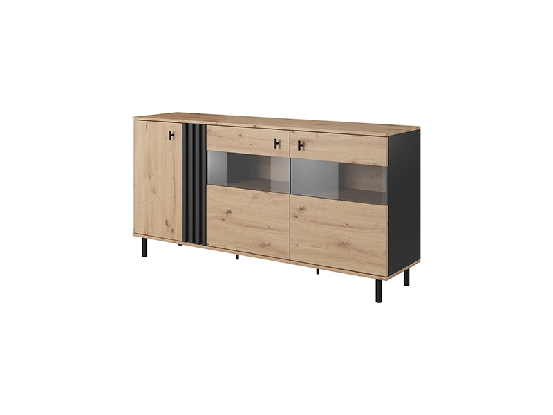 MADIS to zestaw w modnej kolorystyce naturalnego dębu, połączonego z kontrastowym antracytem. Subtelne zastosowanie lameli wpisuje się w nowoczesne trendy w wzornictwie i podkreśla charakter brył. Niestandardowe uchwyty mocnowane pionowo oraz czarne, metalowe nogi nadają meblom lekkości. Kolekcja zaprojektowana dla każdego, kto szuka nietuzinkowego designu, który sprawi, że wnętrze nabierze niesamowitego, oryginalnego wyglądu.