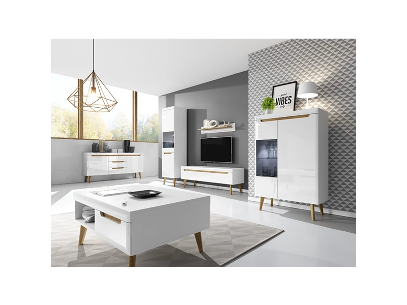 Kolekcja NORDI to doskonałe rozwiązanie dla osób ceniących nowoczesny design, elegancję i praktyczność. Dzięki połączeniu białych, lakierowanych frontów w połysku z ciepłymi drewnianymi elementami, meble te wprowadzają do wnętrza wyjątkową harmonię. Minimalistyczne, a jednocześnie przytulne, sprawdzą się zarówno w salonie, jak i w pokoju dziennym.