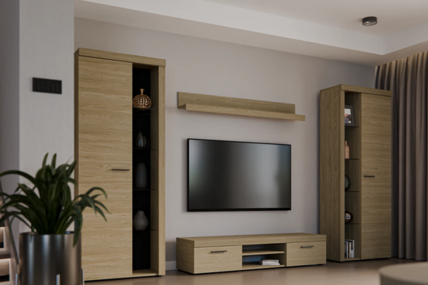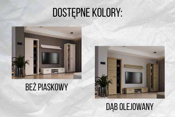 Meblościanka Rumba XL to nie tylko meble, to centralny element Twojego salonu, który pomaga utrzymać ład i porządek. Wybór między naturalnym dębem olejowanym a subtelnym beżem piaskowym pozwala na idealne dopasowanie zestawu do koloru ścian i podłóg w Twoim domu.