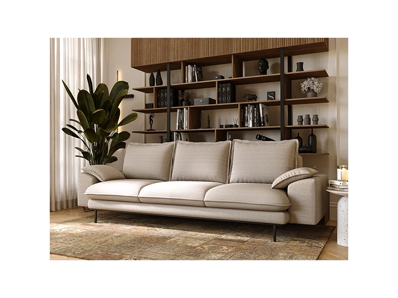 Sofa Sierra prezentuje się niezwykle lekko, co dodaje wnętrzu przestronności i harmonii. Jej subtelne linie nie przytłaczają pomieszczenia, a jednocześnie stają się centralnym punktem aranżacji. Kontrast między miękką tkaniną tapicerską a solidnymi, minimalistycznymi nóżkami w kolorze antracytowym nadaje sofie unikalnego charakteru. To doskonałe połączenie delikatności z wytrzymałością, które przyciąga wzrok i dodaje wnętrzu wyjątkowego uroku.
