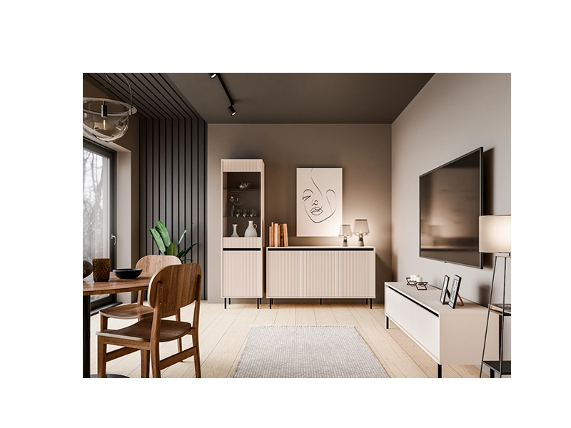 W skład zestawu wchodzą: witryna, komoda oraz szafka RTV, które wyróżniają się prostymi liniami i dbałością o detale: