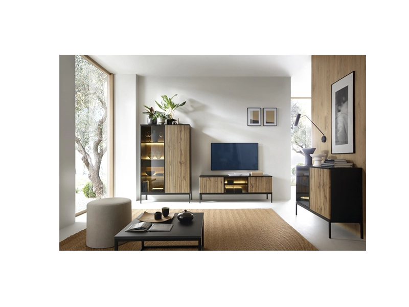 Elegancja czerni z pięknymi dębowymi akcentami podkreślone ciepłym światłem to wszystko, czego potrzeba, aby stworzyć niezapomnianą atmosferę w twoim salonie.